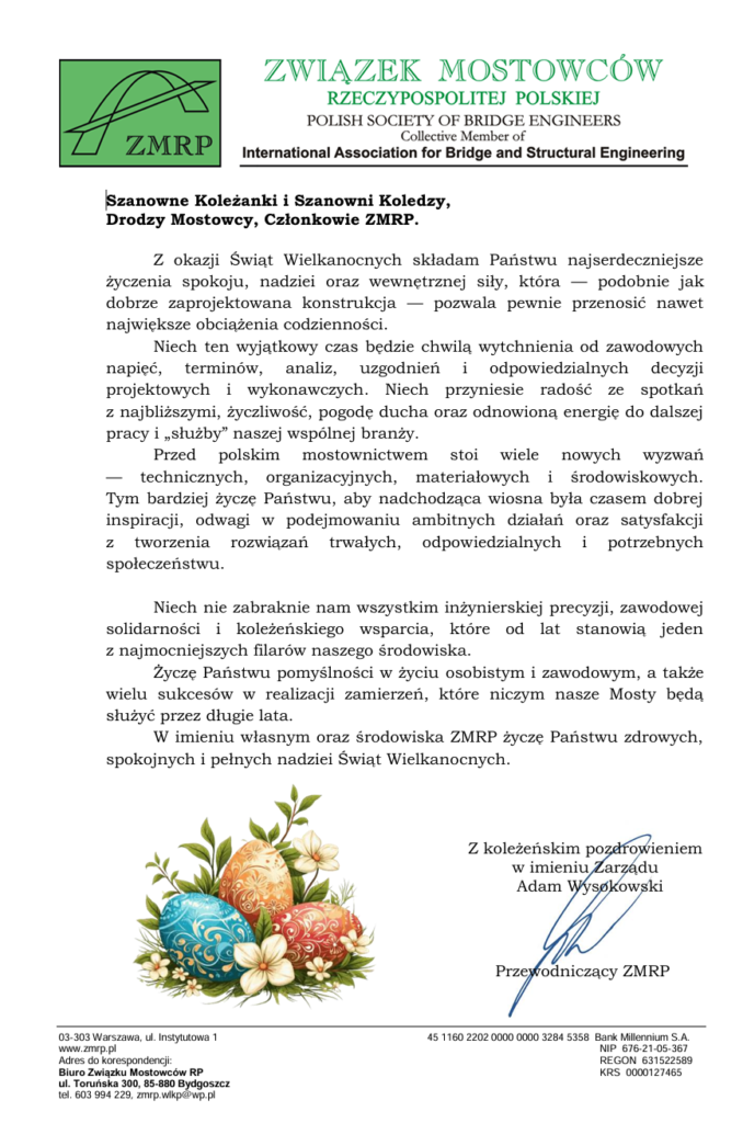 W imieniu Przewodniczącego Związku Mostowców RP przesyłam Państwu w załączeniu życzenia z okazji zbliżających się Świąt Wielkanocnych.
